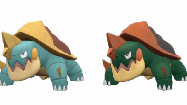 Much like its pre-evolution Shiny Chewtle, Shiny Drednaw makes a significant change to its color palette. It changes its color from baby blue, yellow, bronze, and gold to yellow, bronze, and black. You can catch this shiny at the Casseroya Lake, East Province Areas Two, and Three, Glaseado Mountain, South Province Areas Five and Six, and West Province Area Two
