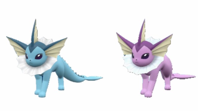 Shiny Vaporeon drastically changes its appearance compared to its non-shiny version. It changes its body and head color from blue and navy blue to pink and violet. You can catch this shiny at Casseroya Lake, Glaseado Mountain, North Province Area Two and Three, South Province Area Six, the Tagtree Thicket, and Casseroya Lake