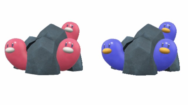 Much like its pre-evolution Shiny Wiglett, Shiny Wugtrio changes its color palette significantly. Its color changes from red and flesh to deep blue and yellow. You can catch this shiny at North Province Areas One and Three and West Province Area Two.