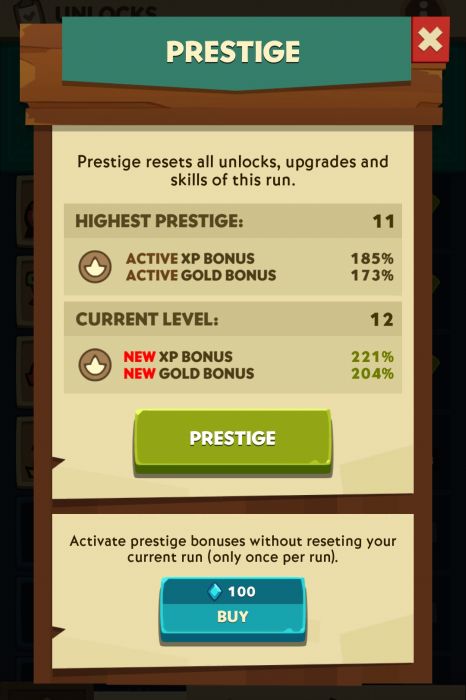 In this game mode, you should prestige a bit more often than you normally do in the main Adventure, since you want Lia to have the highest possible boosts in order for you to reach level 55 ASAP.
