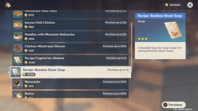 In our case, players can purchase the Bamboo Shoot Soup recipe from the Wangshu Inn boss – Verr Goldet.