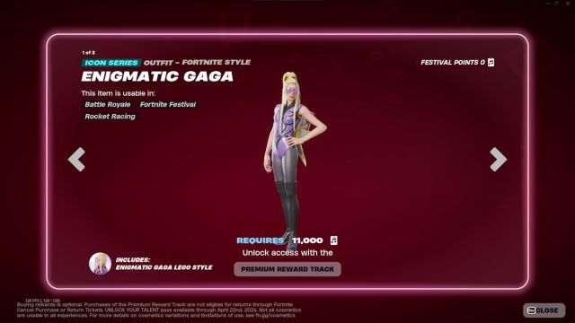 The premium track contains exclusive rewards like Jam Tracks, instruments, and of course the Enigmatic Gaga skin at 11,000 Festival Points. Just buying the premium Festival Pass won’t net you the skin; you still need to complete the quests to earn enough Festival Points.