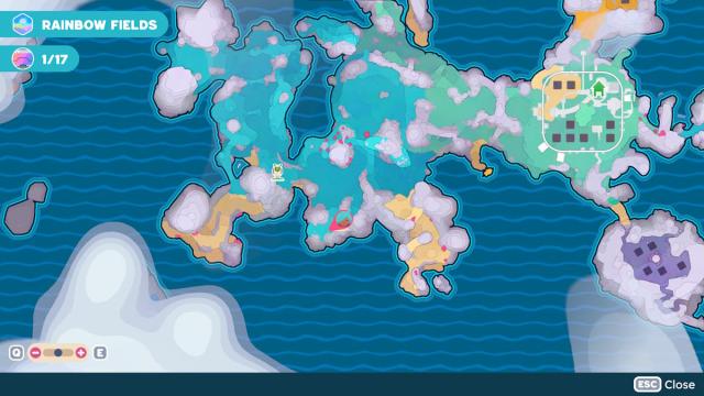 You’ll find a Cotton Gordo blocking a cave entrance. Feed it 30 vegetables, and it’ll burst, opening the way forward. This way leads you to a strange contraption that activates a portal near the southwest corner of Rainbow Fields, which you see across the water.