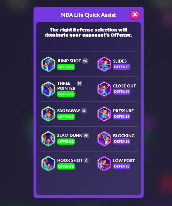 For example, if we’re in the third quarter and we only have Hookshot and Fadeaway in offense and the opponent has Pressure and Closeout in defense, we’ll play the Hookshot because no matter what the opponent plays, they won’t have the required move to get the bonus against our.