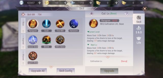 The Wizard skills, much like all the other classes, are all locked to the Cultivation level that they have. So when your Cultivation level is Base, then you will only have access to the first row of skills.