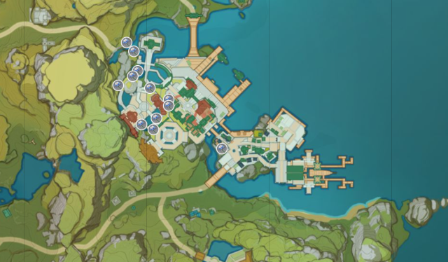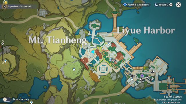 The First Location is Liyue Harbor – Teleport to the waypoint between Liyue Harbor and Mt. Tianheng.