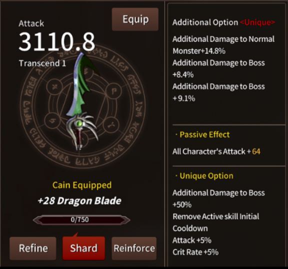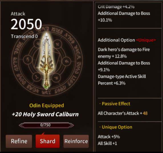 The Dragon Blade’s Unique Option is great for Cain as well as for any other DPS whose skill melts bosses and monsters alike (like Odin). You should try to use this weapon on another character on your team because it has some really good passive stats that’ll give heroes a great boost.