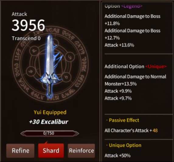 You want Ascalon tailored for Cain (or for your second damage dealer) because it’s a great weapon that works wonders against bosses. As for the stats (Option/Additional Option) you want to look either for flat damage (ATK), damage to bosses, damage to normal monsters, or elemental damage type according to the hero (as shown in the image).