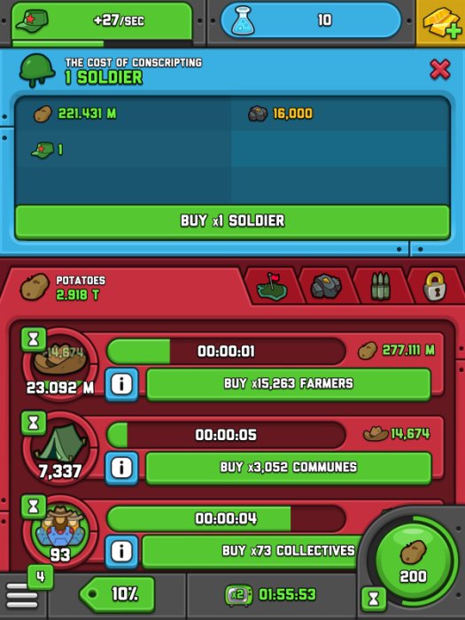 The game is absolutely crazy in terms of stuff you can and have to buy and upgrade, each new thing being connected to at least a couple of other industries. This is pretty difficult to keep track of, but the golden rule of thumb is to start with the Potatoes and work your way up there.