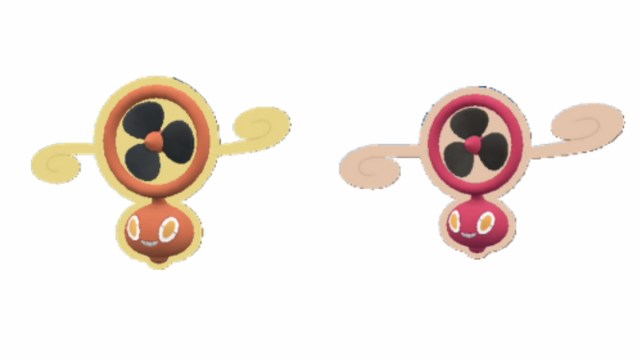 Shiny Fan Rotom, like its other forms, has a noticeable difference in color when compared to its non-shiny counterpart. Its color palette changes from orange and yellow to red and peach. You can obtain this shiny by using the Rotom catalog on your Shiny Rotom and selecting Electric Fan.