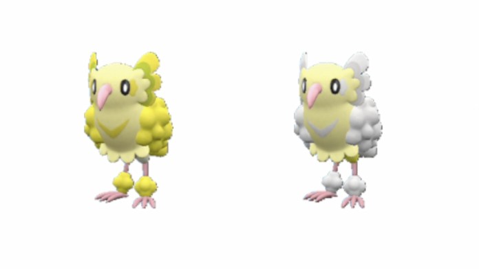 Shiny Oricorio (Pom-Pom Style) has a small but noticeable difference in color compared to its non-shiny counterpart. It changes the color of its yellow feathers to white. You can catch this shiny at South Province Area One.