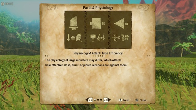 You can carry up to three weapons at any time, and you can switch between them in combat via the Skills menu. The game also tells you which weapon is more effective against any monster you are attacking by highlighting it in blue if it is effective, or with a red slash if it is not after attacking an enemy. If a monster is weak against a certain damage type, you will have a higher chance of breaking one of its body parts.