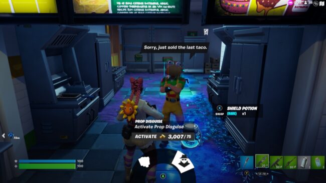 Guac is at his restaurant as usual, selling Prop Disguises and Chug Splash in Greasy Grove.