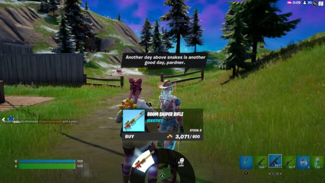 Rustler is hanging out on a hill at Grim Gables and is selling the Boom Sniper Rifle, or the chance to tip the Bus Driver.