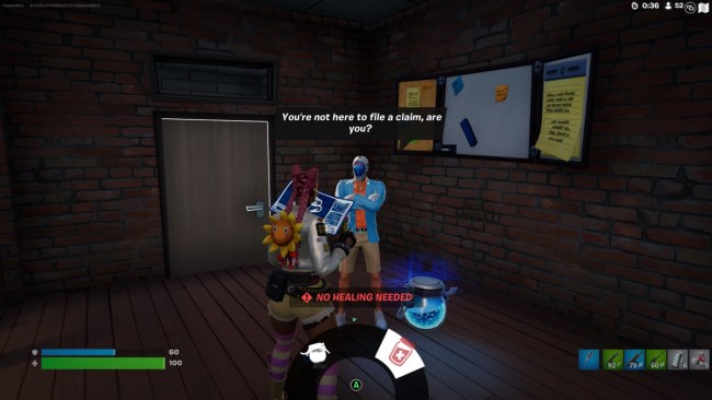 The Underwriter is found at Tilted Towers selling Large Shield Potions or a healing top up.