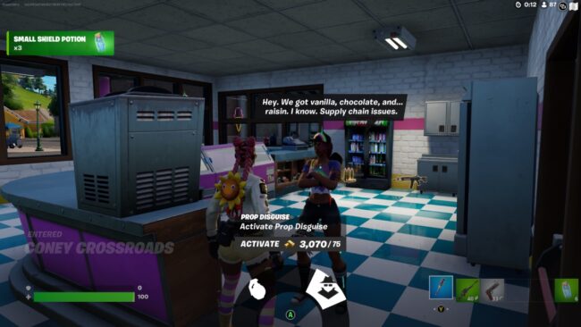 Beach Bomber is at Lil’ Whips’ Ice Cream Parlour in Coney Crossroads where she sells Boogie Bombs and a Prop Disguise. Prop Disguise turns you into an object for a small amount of time, or until you draw a weapon or get shot.