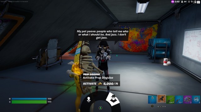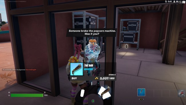 This spooky guy is an NPC added for Fortnitemares 2022 and can be found wandering around between Tilted Towers and Chrome Crossroads. He sells a legendary rarity Pumpkin Launcher and candy.