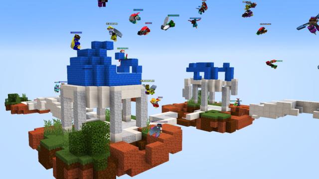 Sky Battle is based on the classic Minecraft PvP mini-game, Skywars. Teams start on their own corners of the map with access to all sorts of resouces. Build up your fort, fight your way to the center of the map, and conquer the enemy team!