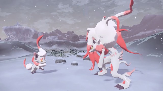 The Hisuian variants of the Zorua line both possess white and gray fur with red tails. They have deep, amber-colored eyes and a haunting disposition.