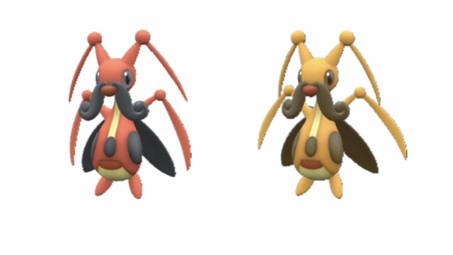Unlike its pre-evolution Shiny Rellor, Shiny Rabsca has a less significant change in color but is noticeable nonetheless—and personally one of our favorites. It changes its color to gold from metallic sky blue. You can obtain this shiny by evolving a Shiny Rellor.
