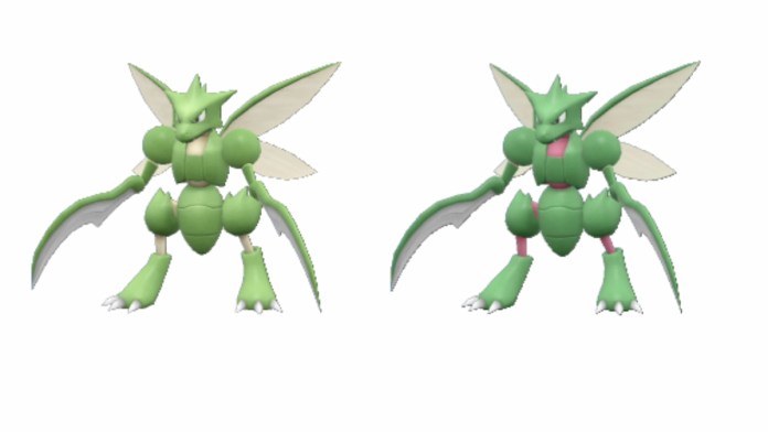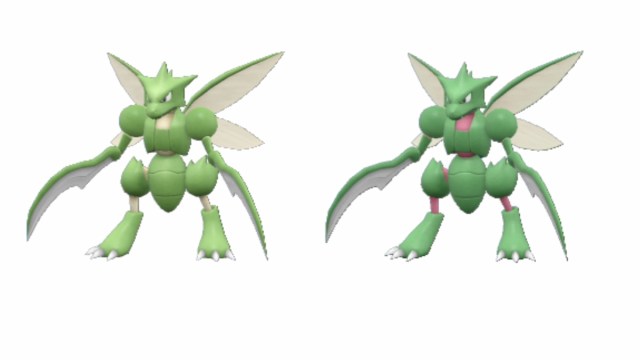 Shiny Scyther barely differs in color from its non-shiny counterpart. It just darkens the shade of its color to regular green from apple green. You can catch this shiny at Casseroya Lake, North Province Area Two, South Province Area Four, and South Province Area Six.