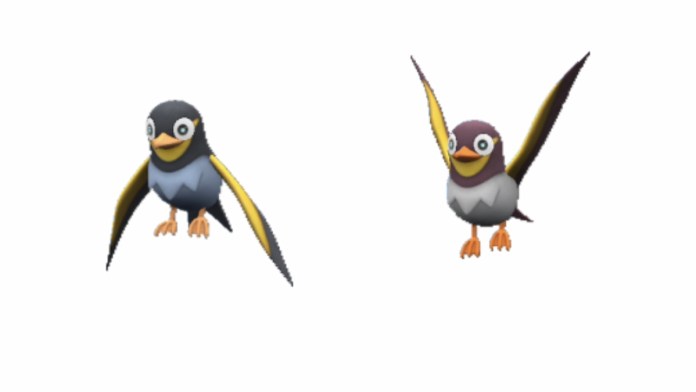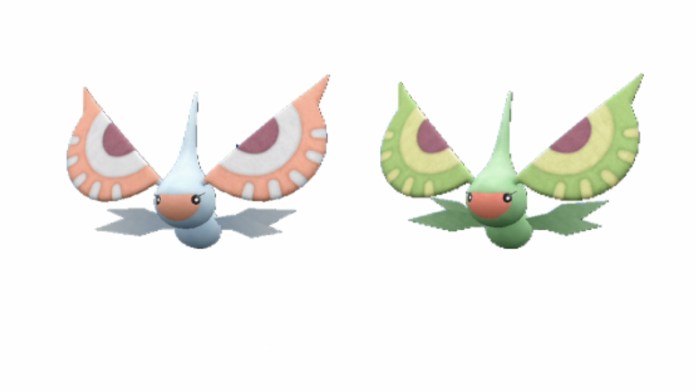 Shiny Swablu’s color has undergone a subtle but noticeable change. It goes from having blue wings with white bodies to having yellow wings with white bodies. You can catch this shiny at East Province Area One, South Province Areas Five, Three, Four, and Six, West Province Area One, and Casseroya Lake.