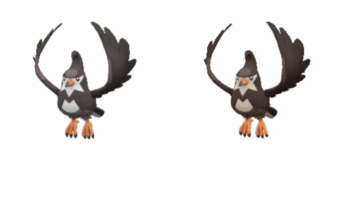 Shiny Staravia’s color difference is similar to its pre-evolution Shiny Starly. It adds a brown tinge to the original black and gray colors. You can catch this shiny at South Province Area Four and West Province Areas Two and Three.