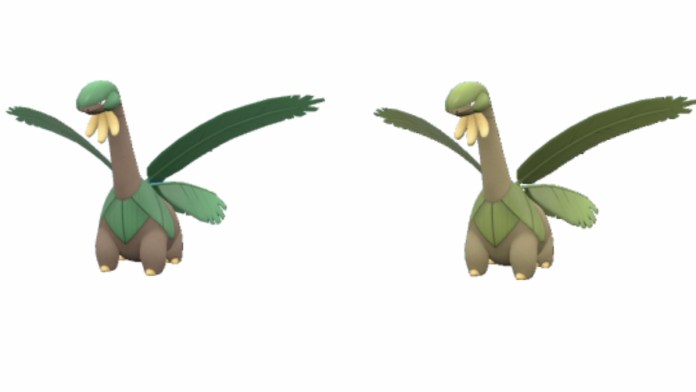 In comparison to its non-shiny counterpart, shiny Tropius undergoes a fairly significant change Comparedin color. From brown and green, it changed into a dirty yellow and light green. You can catch this shiny at Casseroya Lake and West Province Area Three.