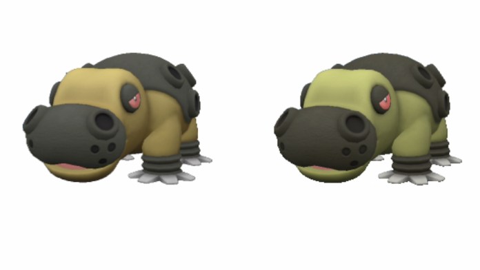 Shiny Hippowdon’s color change is pretty hard to miss when compared to its non-shiny counterpart. It changes the color of most of its body from beige to moss green. You can get this shiny at Asado Desert.