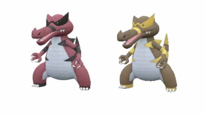 When comparing this Shiny Krookodile to its non-shiny counterpart, you can see a big difference in color. It completely changes its color palette from red, black, and white to light-brown, yellow, and white. You can get this shiny by evolving a Shiny Krokorok.