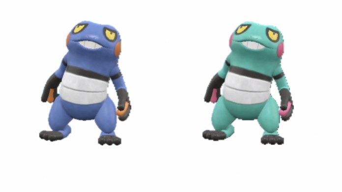 Like its pre-evolution Shiny Croagunk, Shiny Toxicroak also wholly changes its color scheme. It goes from having a blue body, a red throat, and orange claws to having a teal body with a pink throat and claws. You can catch this shiny at Casseroya Lake.