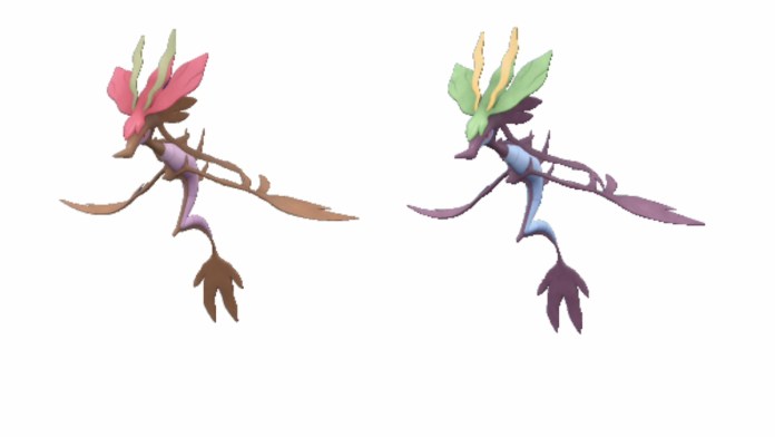 Compared to its non-shiny counterparts, this shiny has a reasonably noticeable color change. It switches to a silver, gray, red, yellow, and violet color palette. You can catch this shiny at the Tagtree Thicket, Casseroya Lake, and North Province Area Two.