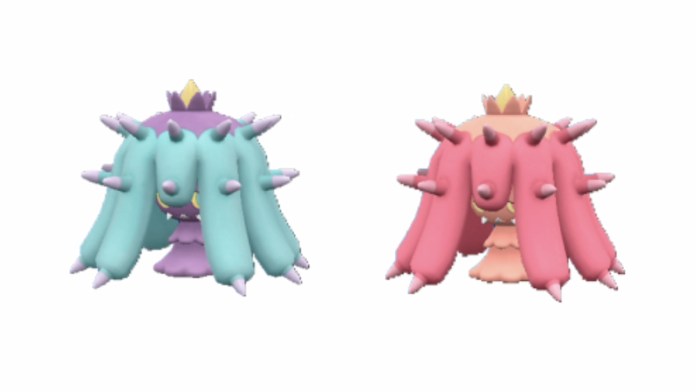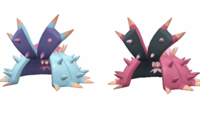 Shiny Toxapex’s inner shell is black instead of purple in the original. The outer shell color also differs between the two versions— powder blue in the original and pale pink in the shiny version. You can have this shiny by evolving a Shiny Mareanie.