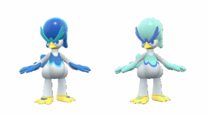 Like its pre-evolution Shiny Quaxly, Shiny Quaxwell has little difference compared to its non-shiny variant. Shiny Quaxwell changes the color of its hair and hands from blue to a lighter mint blue color. You can get this shiny by evolving a Shiny Quaxly.