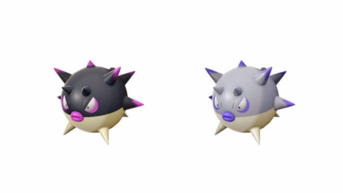 This shiny completely changes its color palette compared to its non-shiny counterpart. It changes its color from black and dirty white to dark pink and light pink. You can catch this shiny at the East Paldean Sea, the North Paldean Sea, the South Paldean Sea, and the West Paldean Sea.
