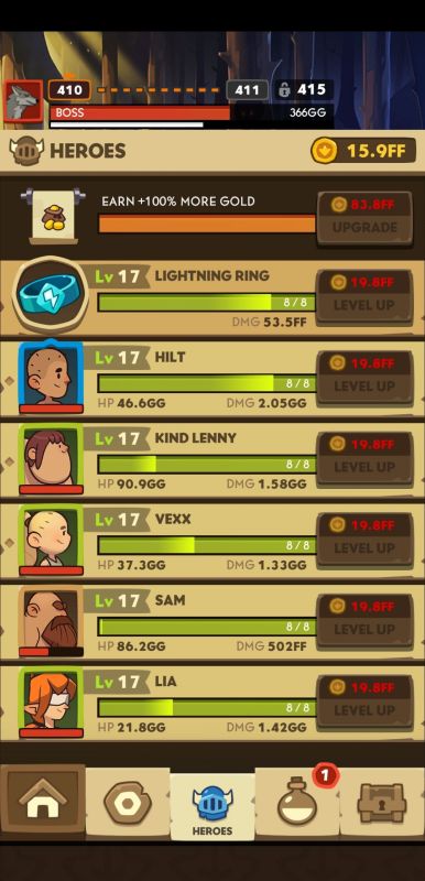 Later on, you will unlock artifacts which will make these income-focused heroes pretty much useless in my opinion and you will get better gains from bringing damage-oriented (or even a support if you don’t have any) heroes to your team, as you will get farther each time.
