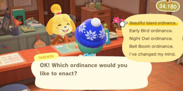 You can set Ordinances at Resident Services. Talk to Isabelle and she’ll briefly explain to you that Ordinances are “passive effects” that change the way your island operates. Choose “Review Island Features,” then “Discuss Ordinances”. It costs 20,000 Bells to enact an Ordinance, and they take effect the following day and last until you deactivate them yourself. There are four Ordinances to try out: Beautiful Island, Early Bird, Night Owl, and Bell Boom.