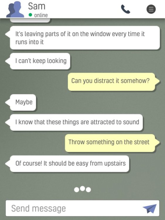 An interesting concept without doubt, but early on it made me feel a bit more frustrated than excited or curious about the outcome of the adventure. There are moments when you only exchange a few words and nothing much happens before Sam disappears for a while. This is risky because the game might not have enough time to hook up everybody and make them care about Sam, about what happened or waiting for his next update.