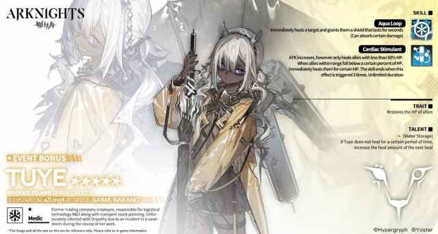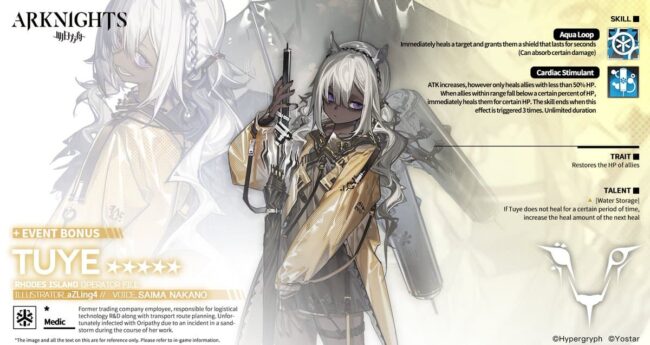 Tuye is one of the many operators in Arknights that players can use in their team. She is a five-star Medic and a supporting character whose healing capabilities are better than many, if not the best.