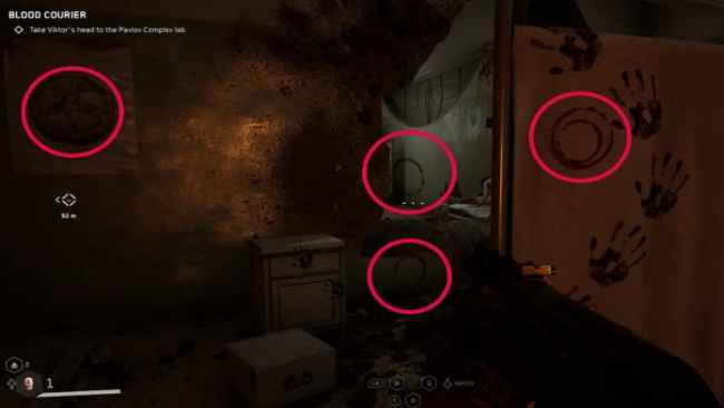 If you stand a little bit to the left of the divider and face it, you should see two other bloody circles in front of you—one on the wall remains next to a nightstand (with more bloody handprints), and another is on the wall in the room ahead.