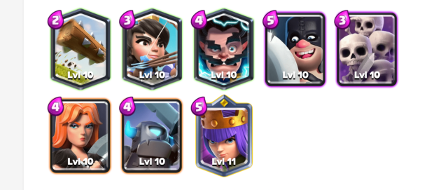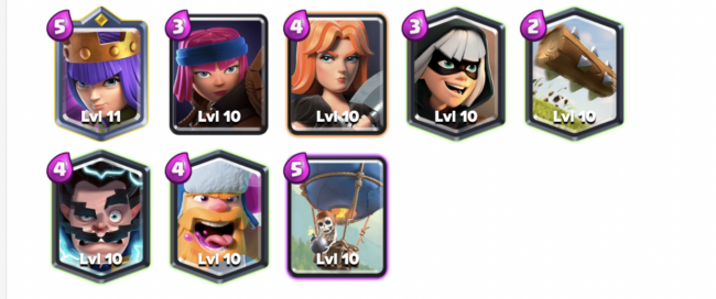 This deck consists of the cards: Archer Queen, The Executioner, Mini Pekka, Valkyrie, Electro Wizard, Log, Skeleton Army, Princess.