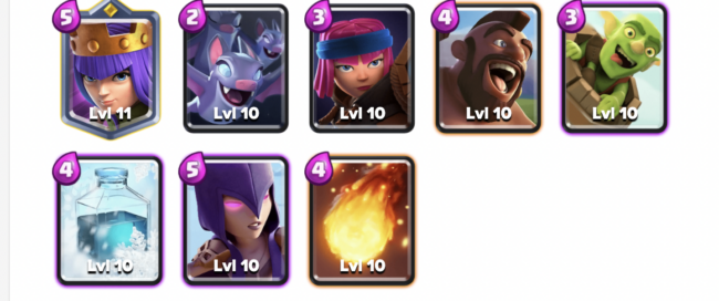 While the deck might seem ordinary, it can do wonders. The Archer Queen and her powerful Cloaking technique allow you to deal with any tanks easily. Your Ice Golem serves as the meatshield for both the Archer Queen and Hog Rider. The Cannon, Fireball and Log are good defense cards and can also deal with crowds of enemies.
