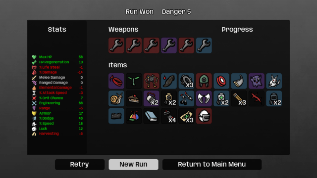 Players should get six screwdrivers/wrenches and all turrets to win with an engineering build. Players can also try to get Cute Monkey since it recovers HP upon collecting items. This effect is perfect for engineering builds, as players will mostly be picking up items.