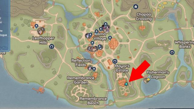 The first fishing spot that we like to hit up is the tiny pond in the Mayor’s Estate, especially if we’re short on cash and don’t have any bait. Head inside the estate, then go out the backdoor to reach the backyard garden. As soon as you enter the garden, turn to your left to find the tiny pond. Here is the exact location: