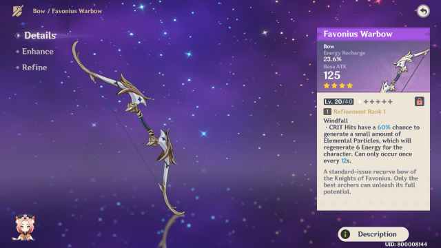 For Gorou, the best weapon in Genshin Impact is Favonius Warbow. This bow is given out for free; thus, everybody has a copy of it. At max level, Favonius Warbow provides 61.3% Energy Recharge, the best stat for burst support characters. Its passive generate energy particles upon a critical hit.