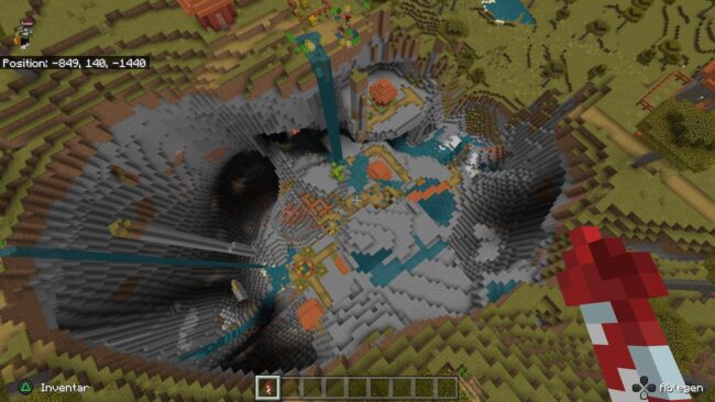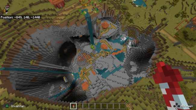 - Cave village (Bedrock seed 215437328): In this seed, a savanna village has generated at the bottom of a large cave opening. If you want to live in a cave village, try this seed.