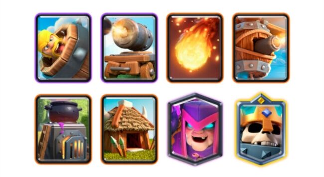 This is yet another high win-rate deck that includes Barbarian Barrel, Cannon Cart, Fireball, Flying Machine, Furnace, Goblin Hut, and Mother Witch. It’s a popular skeleton deck that just swaps out Elite Barbarians using the Skeleton King.