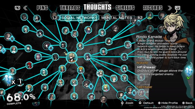 While you may find NEO: The World Ends With You challenging enough on Normal difficulty, you should try to unlock Hard difficulty as quickly as possible. Granted by Minamimoto for 3 FP from Week 1, Day 4, playing at Hard will allow you to obtain different Pins from Noise as drops in combat.