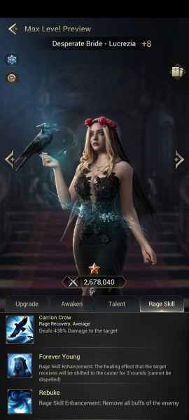 Lucrezia boosts the attack of Bruiser, Rider, and Musketeer troops by an impressive 250%. If you have several Wizards in your team, she becomes a valuable ally. Her rage skill enhancement, Endless Despair, increases the critical chance of Wizard allies by 10%. All of her rage skill enhancements are quite powerful and useful.