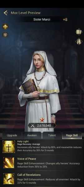 Sister Marci excels as the top buffer in Myths of Moonrise. Her rage skill, Holy Light, enhances the attack of all allied heroes by an impressive 80%, though it reduces their accuracy by 35%. By unlocking the Voice of Peace enhancement, you can reduce this accuracy cost to 25%.